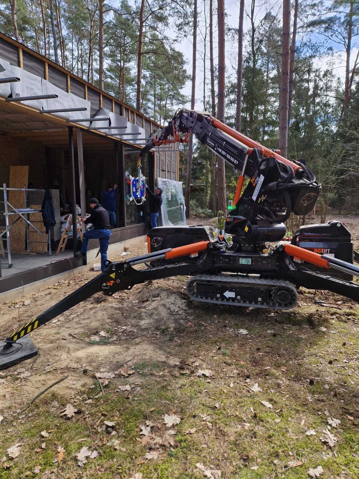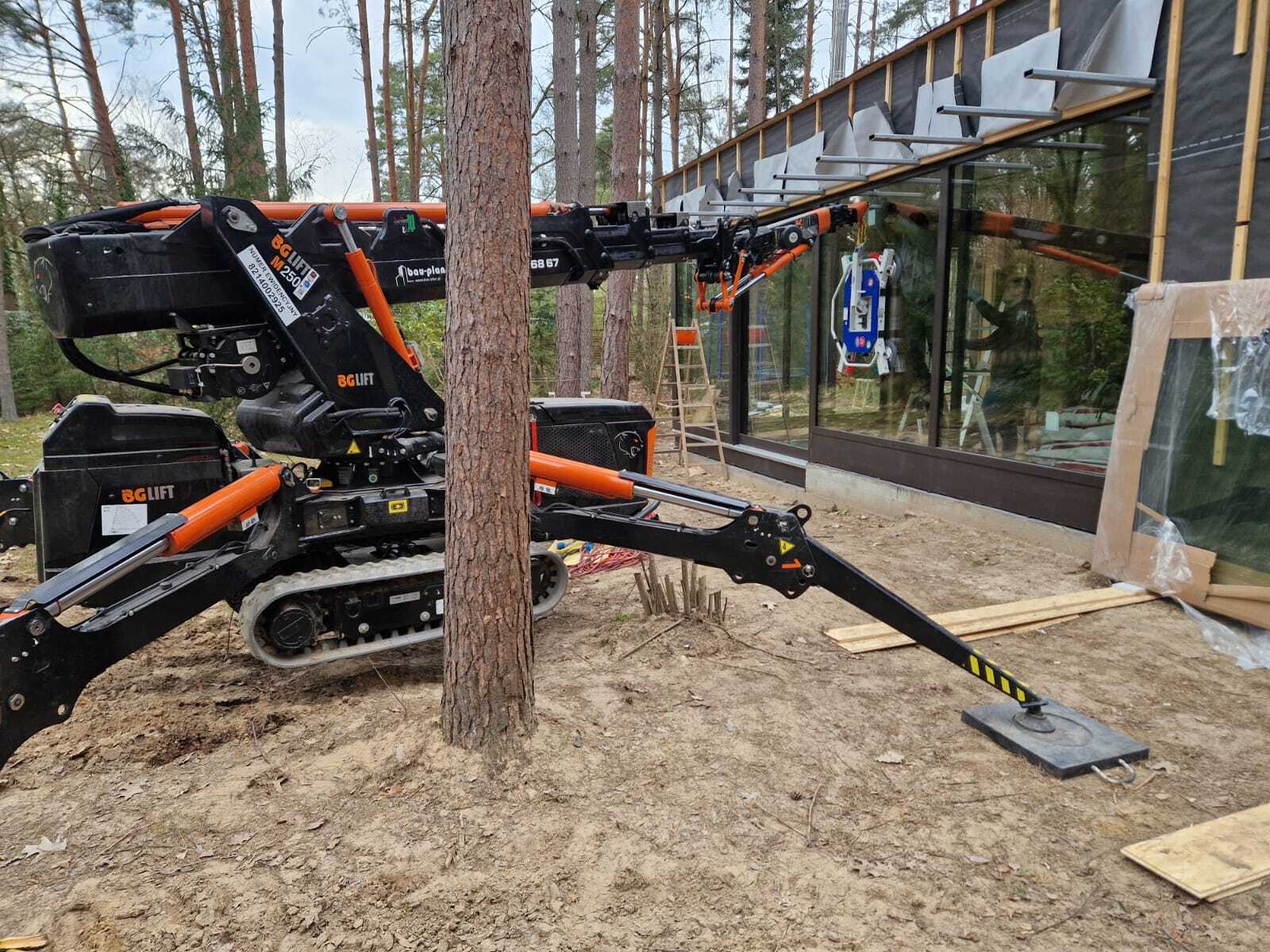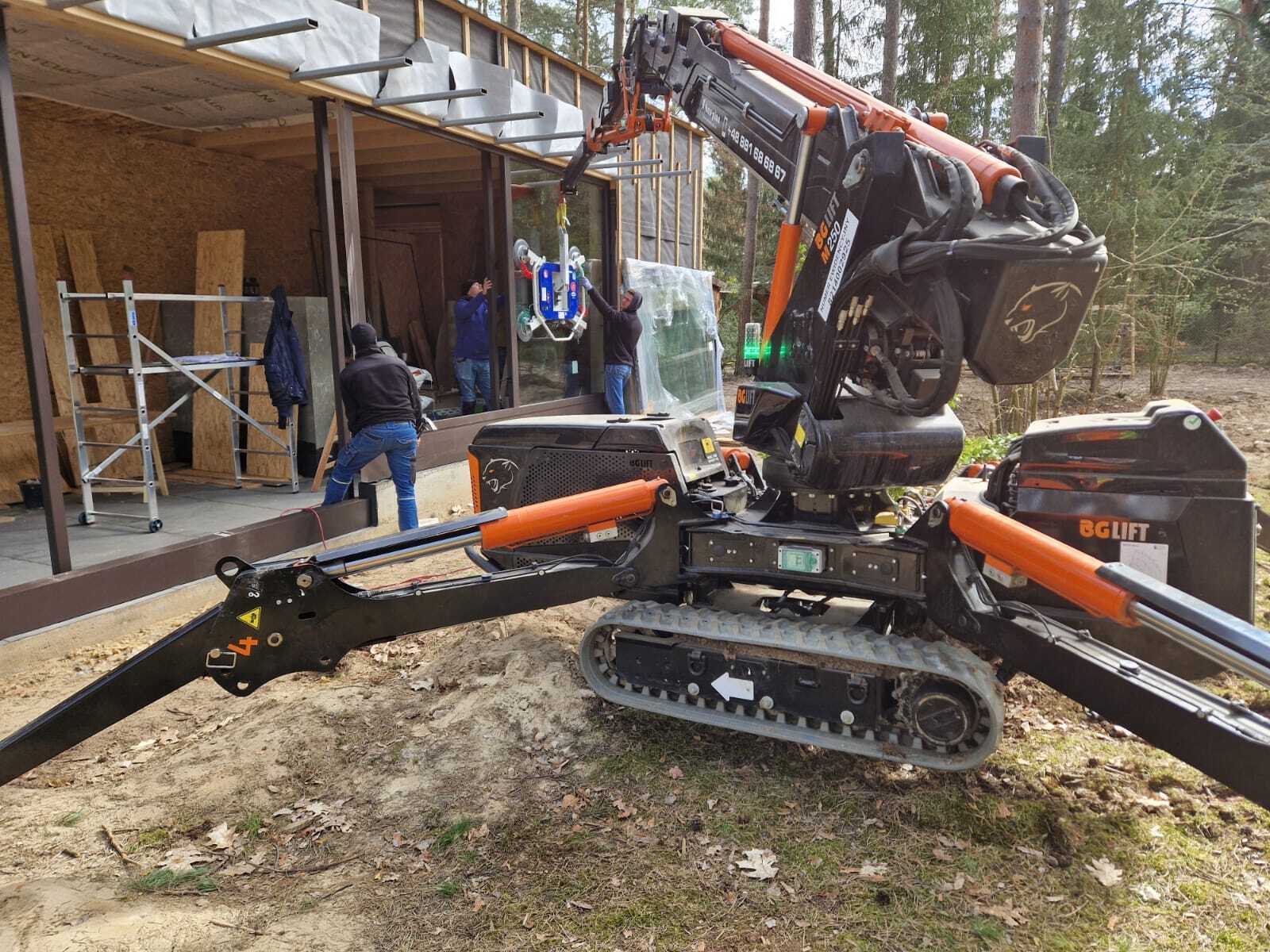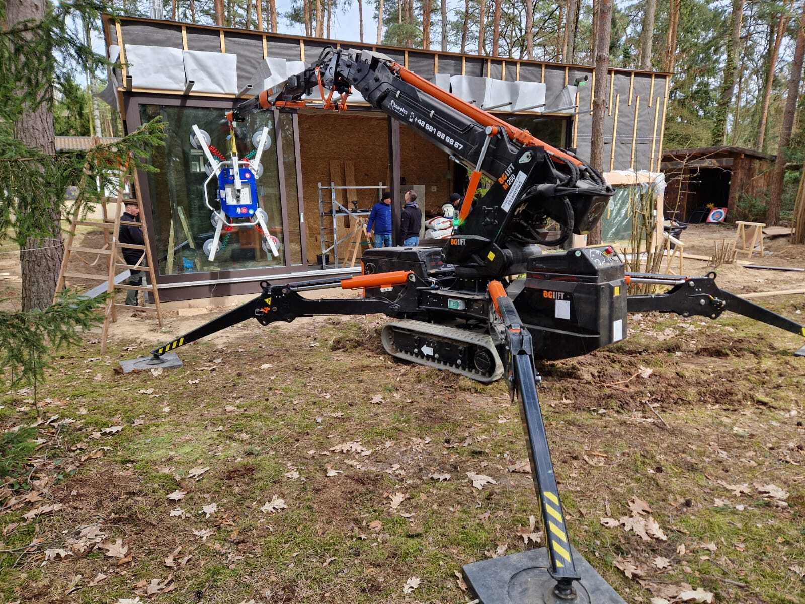 Szklenie okien z wykorzystaniem mini żurawia BG Lift M250 w miejscowości Wandlitz. Oferujemy wynajem mini żurawia z doświadczonym operatorem do prac montażowych, transportowych lub instalacyjnych. / Die Verglasung der Fenster mithilfe Minikran BG Lift M250 in Wandlitz. Wir bieten die Vermietung von Minikran mit einem erfahrenen Kranfahrer für Montage-, Transport- oder Installationsarbeiten an.